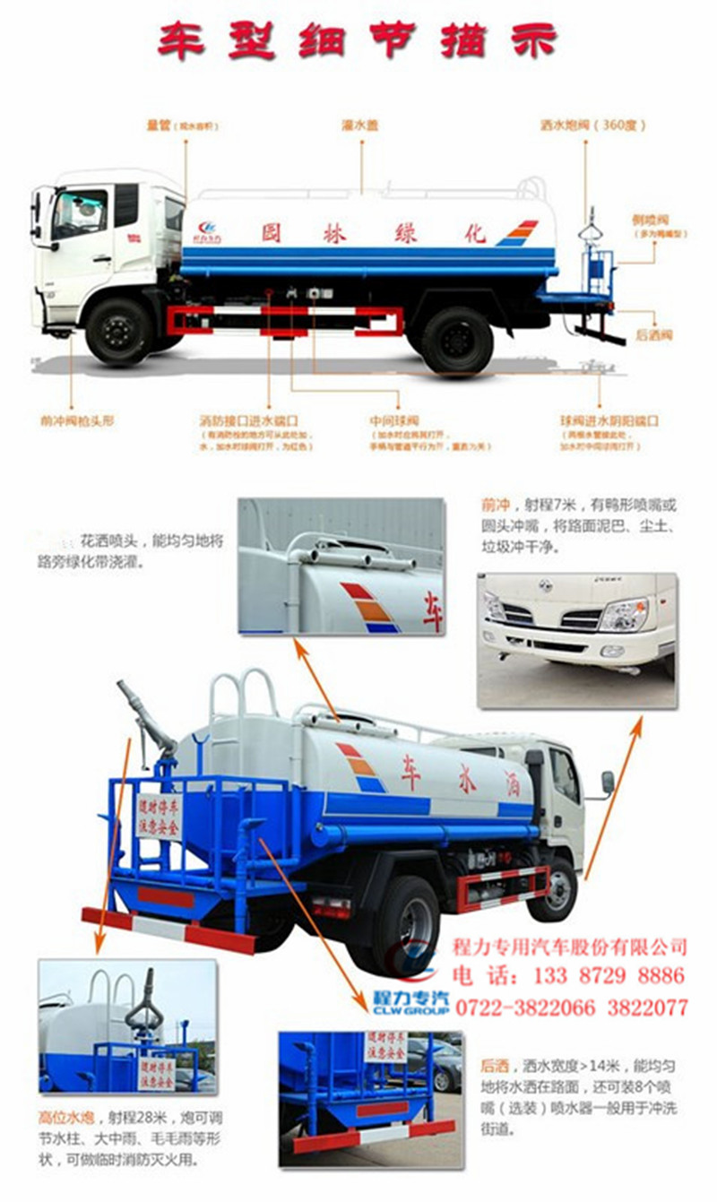 罐體實際容積9.1噸,帶前沖、后灑、側噴、高位花灑,后部帶平臺,平臺上安裝綠化灑水高壓炮(炮噴射形狀可調:直沖狀、大雨、中雨、毛毛雨,可連續調節),配備大功率60/90專用灑水泵,帶消防接頭,帶自流閥,帶自吸功能,帶濾網。吸程≥6米、灑水寬度≥14米、45度角時灑水炮噴射距離可達25-30米